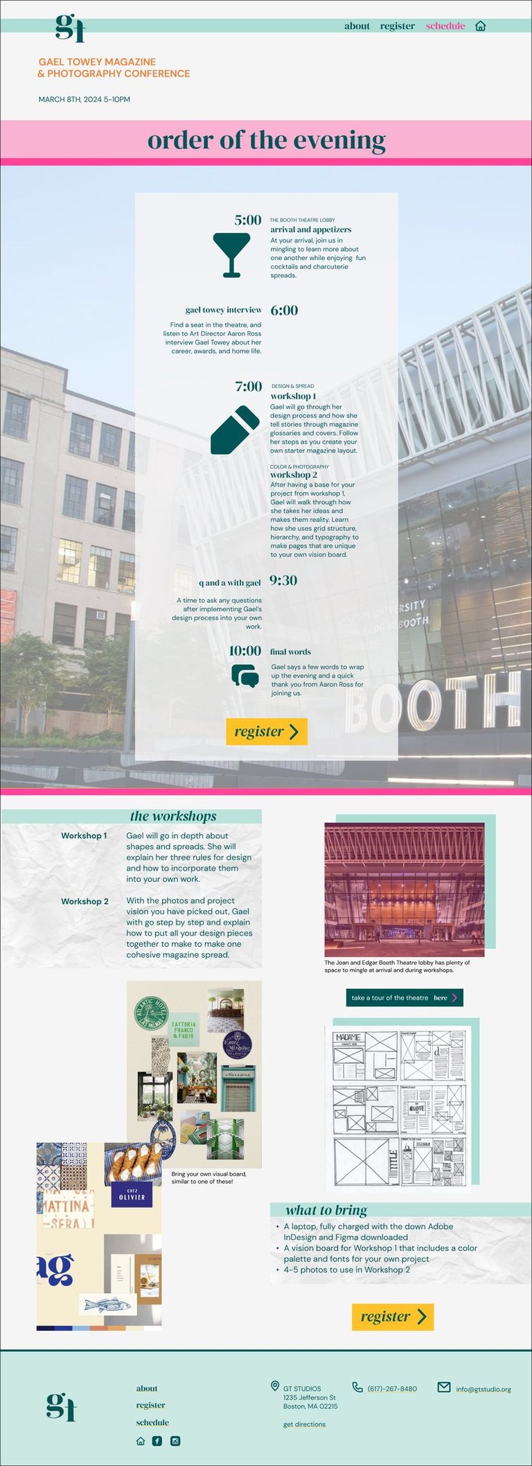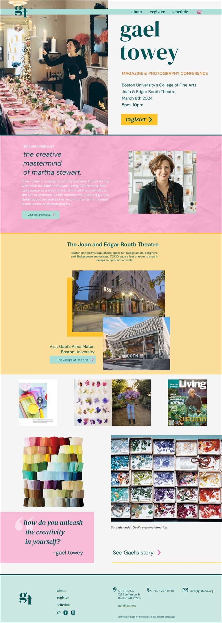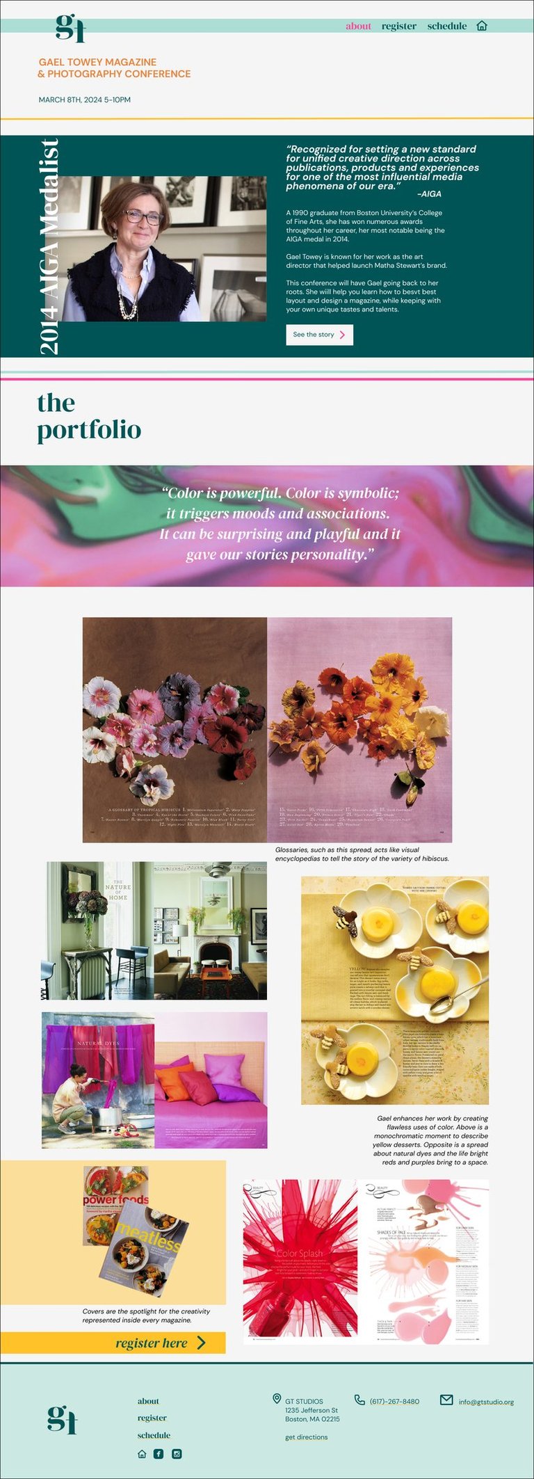 I was tasked sophomore year with selecting a past AIGA medalist and designing an event for them. I selected Gael Towey, known for her bright and bold magazines she designed for Martha Stewart. The conference I created was for magazine design and photography, to learn from Gael and also have workshops for skill development. I created a logo, welcome banner, and a conference website that included home, register, about, and schedule pages.